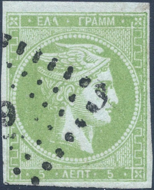 Lot0080 - ΕΛΛΑΔΑ 1862-1867 5λ Ελαιοπράσινο (Olive-Green) με υπογραφή THEODORE CHAMPION ☉