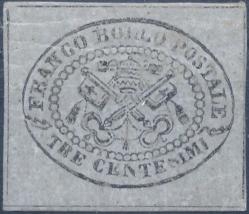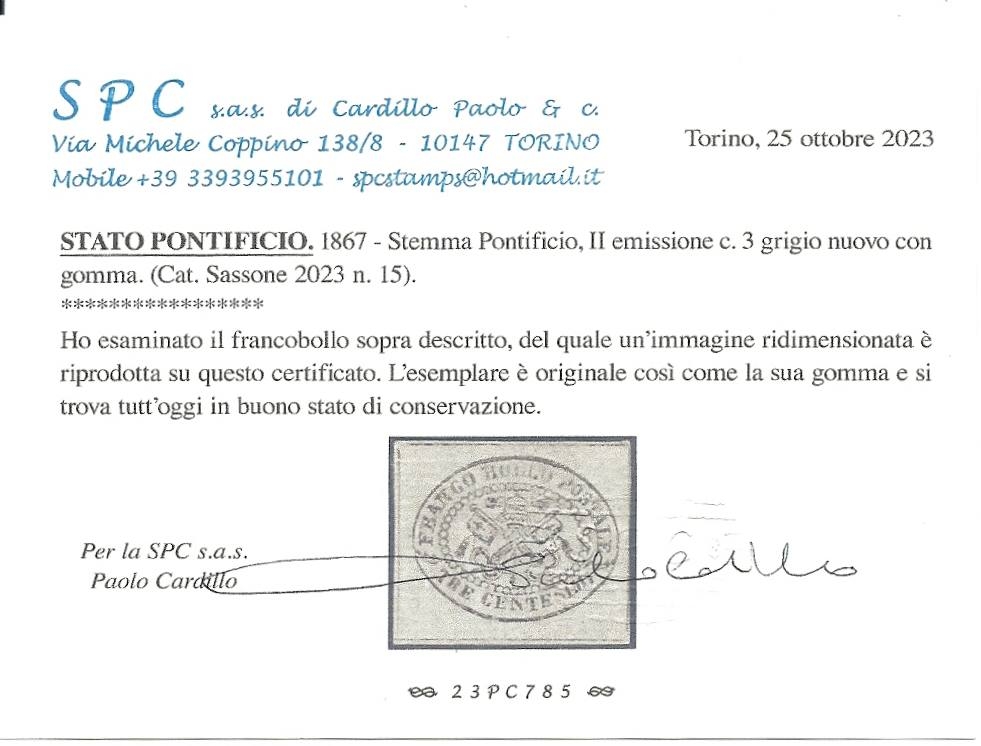 Lot1827 - Italian States Papal States 1867 3 Centesimi grigio MH CERTIFICATE PAOLO CARDILLO Υπογραφή Lyssely ΣΠΑΝΙΟΤΗΤΑ RRR, κατάλογος Sassone No 15 *