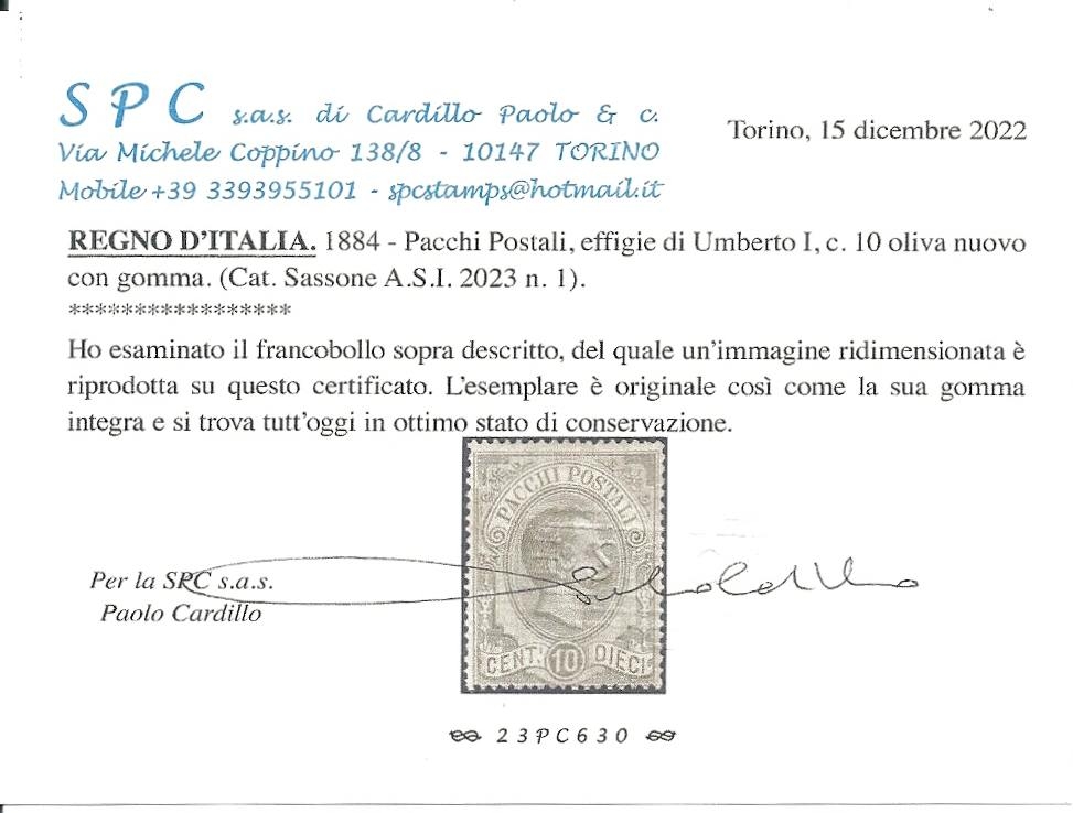 Lot1828 - Italian States Pacchi Postale 1884 10c Oliva MNH CERTIFICATE PAOLO CARDILLO SPC, κατάλογος Sassone No 1 **