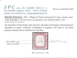 Lot1829 - Regno Di Italia Vitorio Emanuell II 1862 40c Rosa MH buona contrafura CERTIFICATE PAOLO CARDILLO SPC, κατάλογος Sassone No 3d *