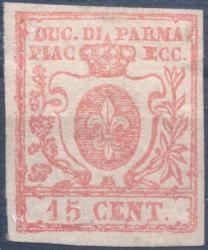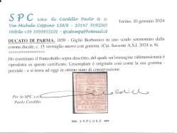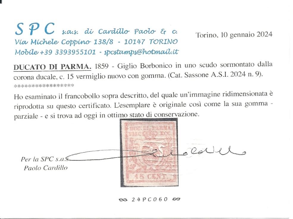 Lot1831 - Italian States Ducato Di parma 1859 15c MH gomma Parziale CERTIFICATE PAOLO CARDILLO SPC, κατάλογος Sassone No 9 *
