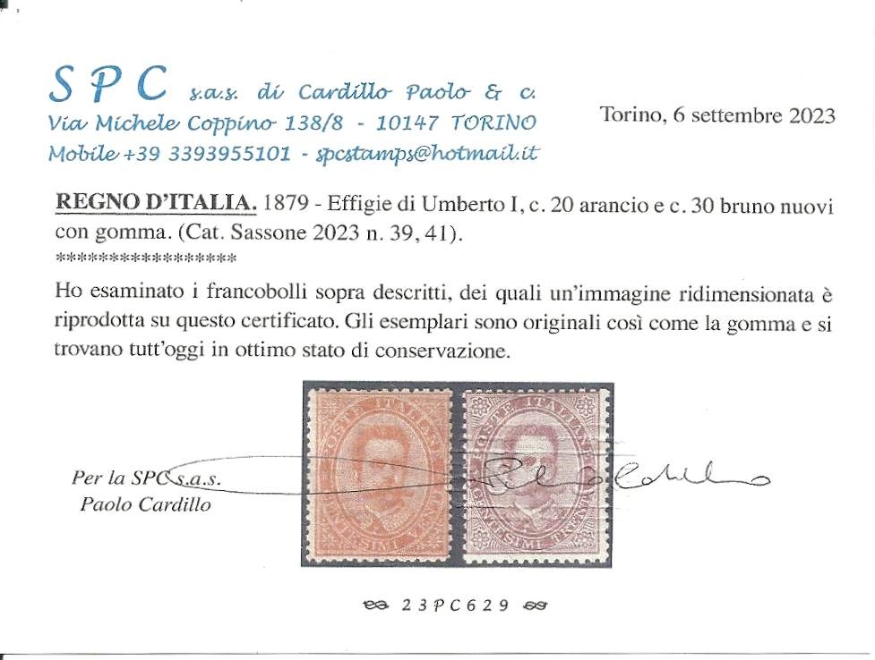Lot1834 - Regno Di Italia Umberto 1879 20c & 30c MH CERTIFICATE PAOLO CARDILLO SPC, κατάλογος Sassone No 39 & 41 *