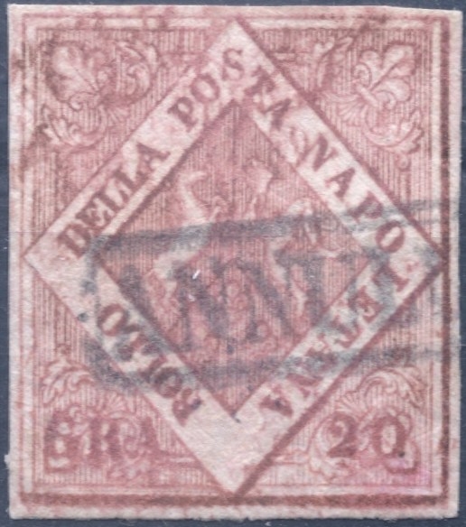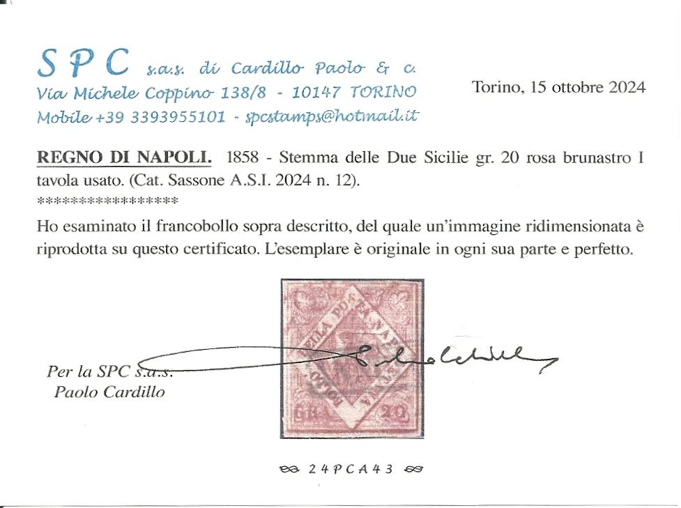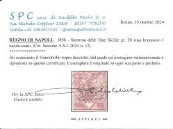 Lot1835 - Italian States Naples 1858 20gr used Rosa Brounostro I tavola CERTIFICATE PAOLO CARDILLO SPC Perfetto stato ΣΠΑΝΙΟΤΗΤΑ RRR, κατάλογος Sassone No 12 ☉