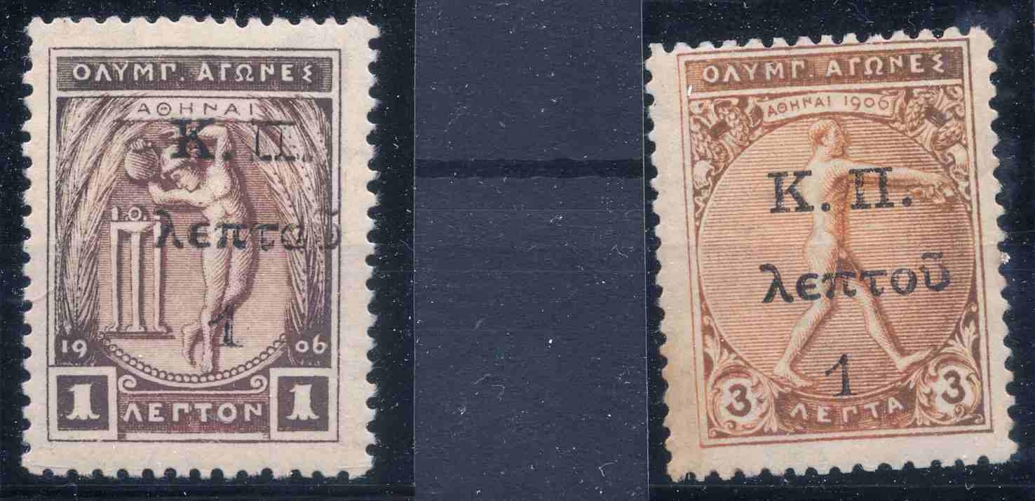 Lot0563 - ΕΛΛΑΔΑ 1917 'ΚΠ με νέα Αξία' επί Ολυμπιακών Αγώνων 1906 ΔΕΝ ΚΥΚΛΟΦΟΡΗΣΑΝ 1λ/1λ, 1λ/3λ *