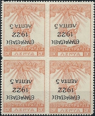 Lot0579 - ΕΛΛΑΔΑ 1923 Επανάστασις 1922 5λ/3λ Τετράδα με ανεστραμμένη επισήμανση **/*/ bl4