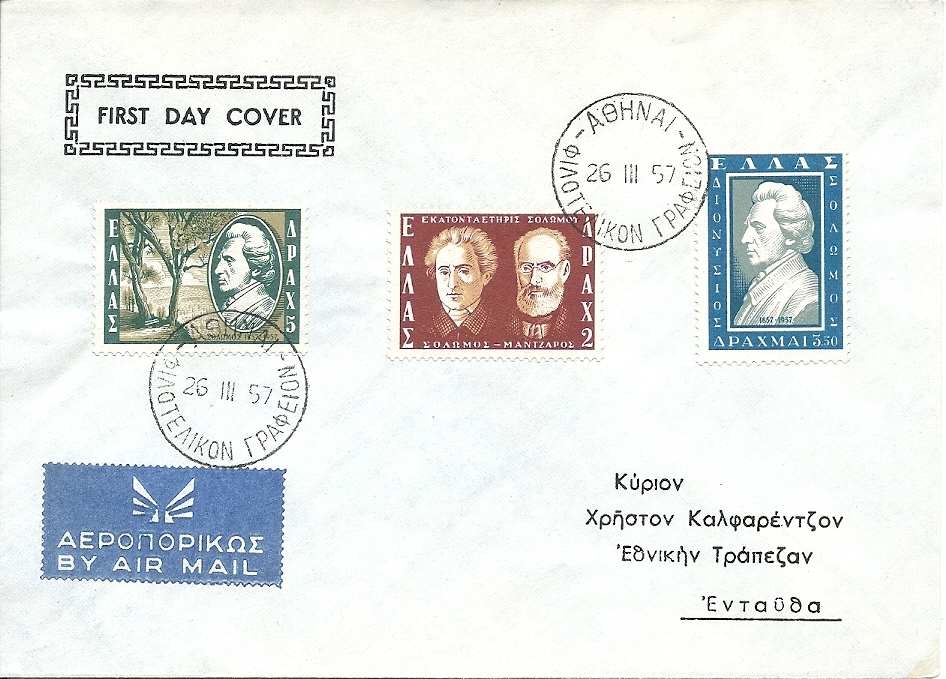 Lot1029 - ΕΛΛΑΔΑ 1957 ΦΠΗΚ (Α) της αναμνηστικής έκδοσης για τα 100 χρόνια από το θάνατο του Διονυσίου Σολωμού ✉