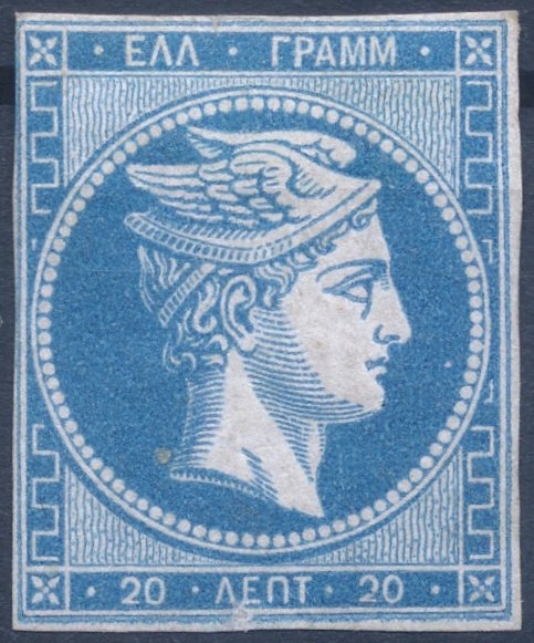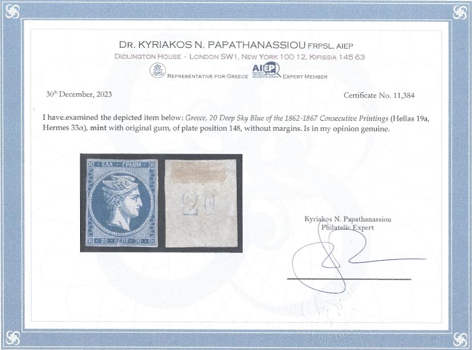 Lot0112 - ΕΛΛΑΔΑ 1862-1867 20 λεπτά μπλέ ουρανί (sky blue) με γόμμα, θέση πλάκας 148, συνοδεύεται με πιστοποιητικό Παπαθανασίου *