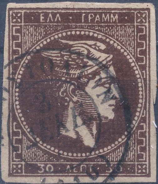 Lot0255 - ΕΛΛΑΔΑ 1876-1877 30 λεπτά καφέ έως πολύ βαθύ καφέ σε κιτρινωπό (brown to sepia on yellowish) με ψαθωτό βάθος, ΣΠΑΝΙΟ ☉