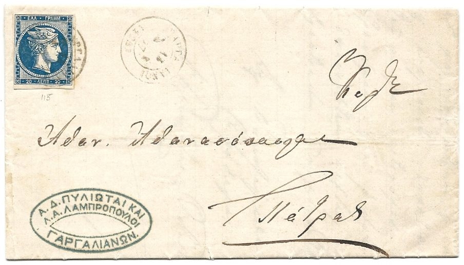 Lot0313 - ΕΛΛΑΔΑ 1875-1880 20 λεπτά μπλε Πρωσικό ανοιχτό σε λευκό χαρτί, επιστολή από Γαργαλιάνους προς Πάτρα ✉