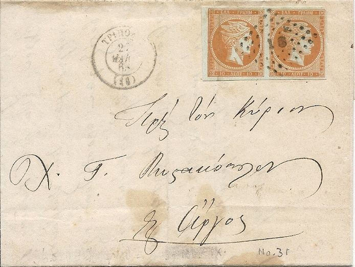 Lot0424 - ΕΛΛΑΔΑ 1863 10 λεπτά ζεύγος Κεφαλών Ερμή σε ταχυδρομημένο φάκελο με ταχυδρομική σφραγίδα 18, ΤΡΙΠΟΛΗ 25 Μαΐου 1863 ✉