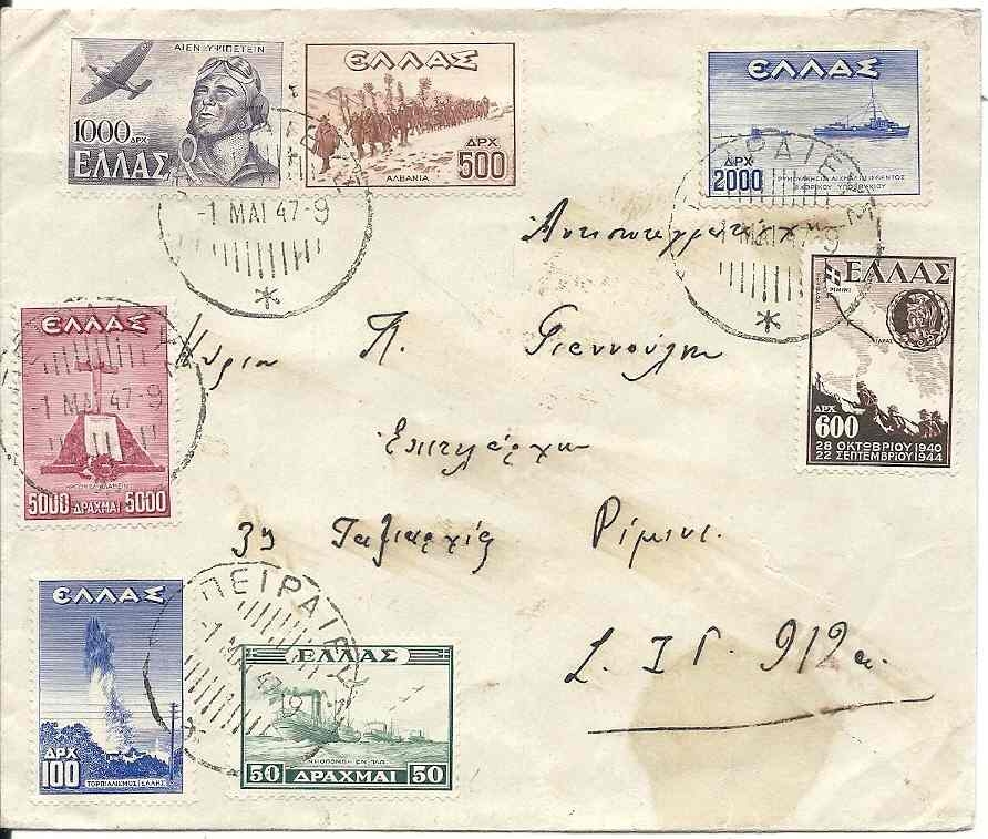 Lot1044 - ΕΛΛΑΔΑ 1947 ΦΠΗΚ (Α) σε 3 φακέλλους για την σειρά ΝΙΚΗ, με ημερομηνίες, σφραγίδες Πειραιά, Λεβίδου, πλατεία Συντάγματος ✉