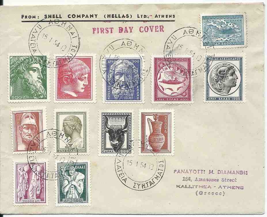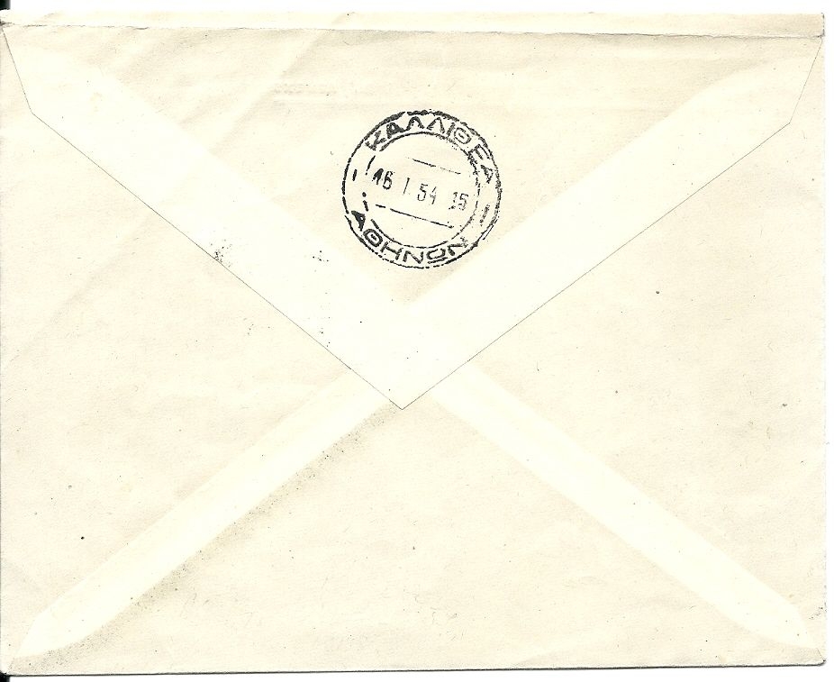 Lot1053 - ΕΛΛΑΔΑ 1954 ΦΠΗΚ (Α) ΑΡΧΑΙΑ ΤΕΧΝΗ Α, με σφραγίδα άφιξης στην πίσω πλευρά ✉