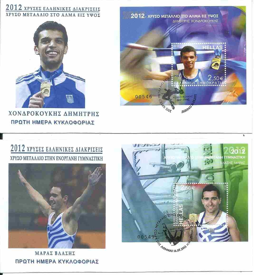Lot1097 - ΕΛΛΑΔΑ 2012 3 ΦΠΗΚ (Α) με τα χρυσά μετάλλια των Δημήτρη Χονδροκούκη και Βλάση Μάρα, ο μεγάλος φάκελλος έχει και τα 2 φεγιέ μαζί ✉