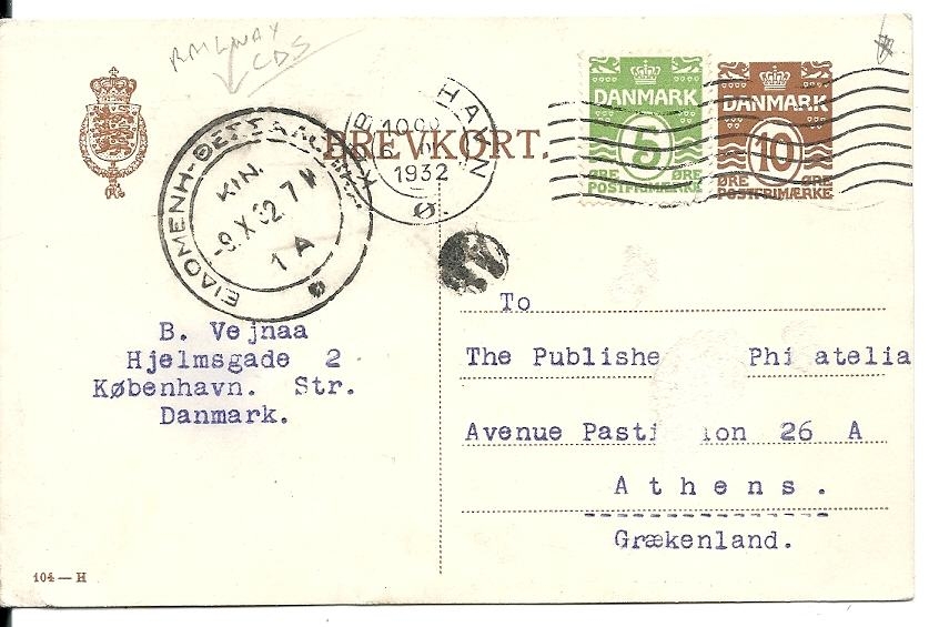 Lot1304 - ΔΑΝΙΑ 1932, επιστολικό Ιδιωτικό Δελτάριο από Δανία προς Ελλάδα με σιδηροδρομική σφραγίδα ΕΙΔΟΜΕΝΗ - ΘΕΣΣΑΛΟΝΙΚΗ, ΚΙΝ 1Α
