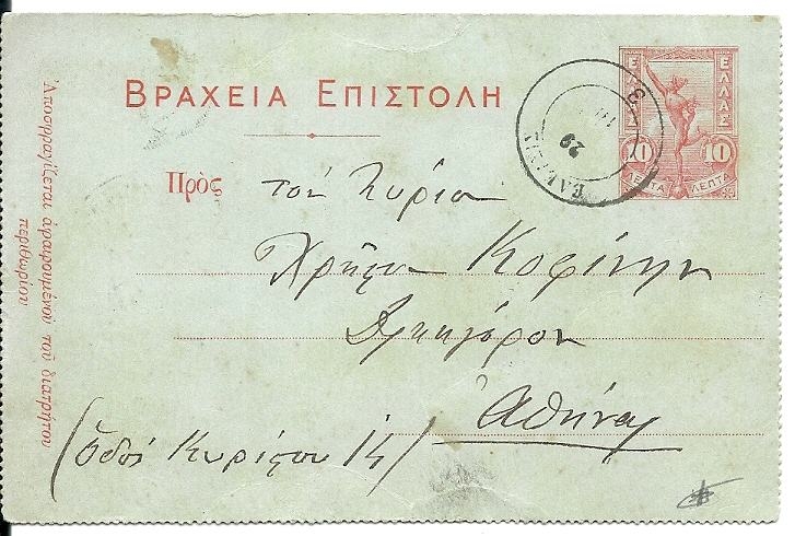Lot1305 - ΕΛΛΑΔΑ 1910 Βραχεία Επιστολήπρος Αθήνα με γραμματόσημο 10 λεπτών Ιπτάμενου Ερμή & σφραγίδα ΕΛΕΥΣΙΣ