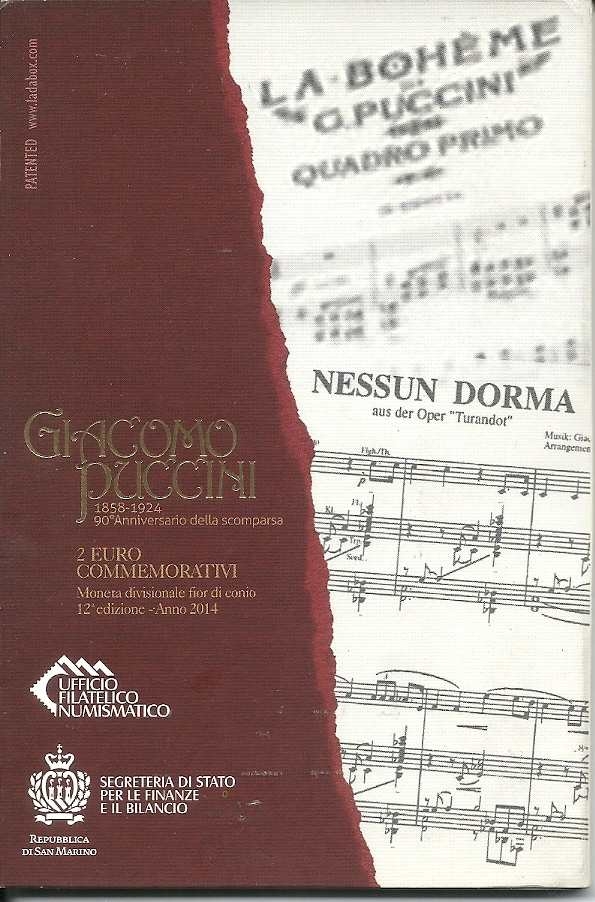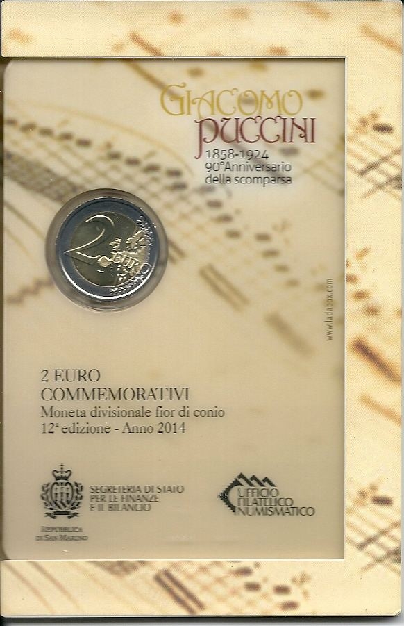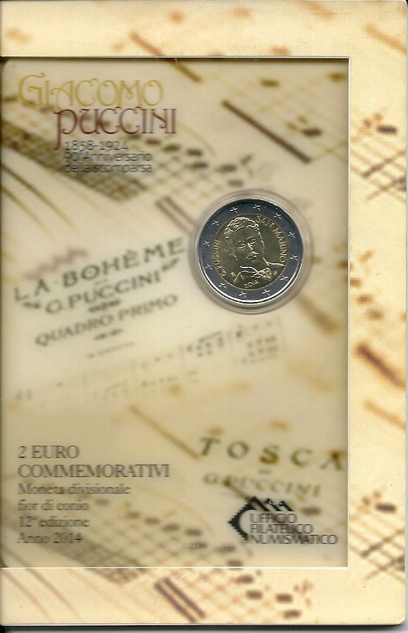 Lot2510 - ΣΑΝ ΜΑΡΙΝΟ 2014, αναμνηστικό, επετειακό, επίσημο 2€ για τα 90 χρόνια από τον θάνατο του Giacomo Puccini.