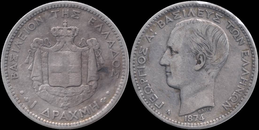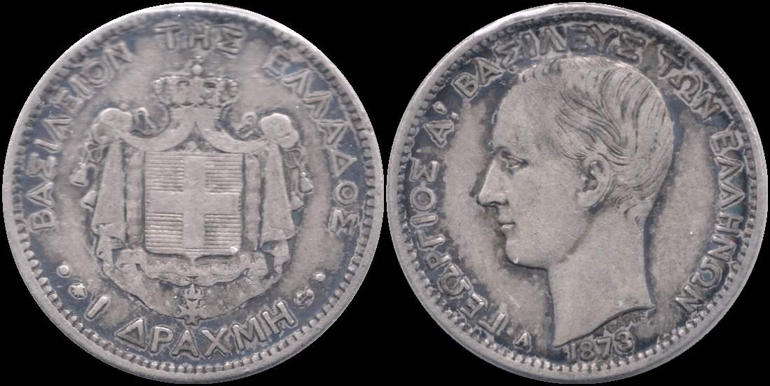Lot2412 - ΕΛΛΑΔΑ 1868-1873-1874-1883 Βασιλεύς Γεώργιος Α', λαχνός, 1 δραχμή , 4 κομμάτια, αριθμός καταλόγου Hellas : ----