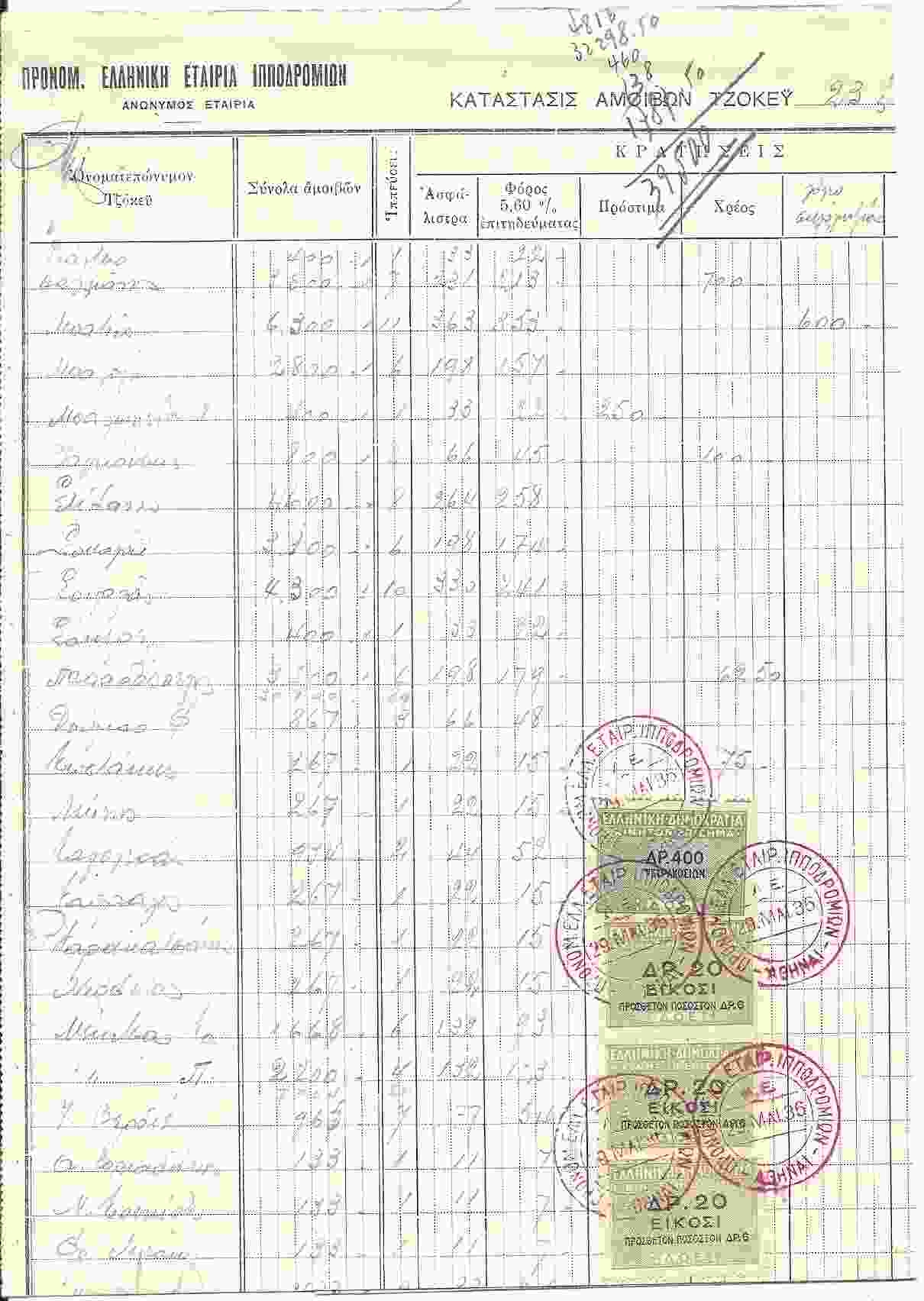 Lot2815 - ΕΛΛΑΔΑ 1928, Ελληνική Εταιρεία Ιπποδρομιών, 4 χαρτόσημα και κόκκινη σφραγίδα των ιπποδρόμων σε μισθολογική κατάσταση τζόκεϋ.