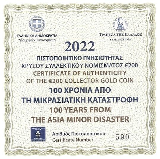 Lot2531 - ΕΛΛΑΔΑ 2022, Χρυσό συλλεκτικό νόμισμα 200€ 100 Χρόνια από την Μικρασιατική καταστροφή, στην επίσημη συσκευασία, με πιστοποιητικό γνησιότητας.