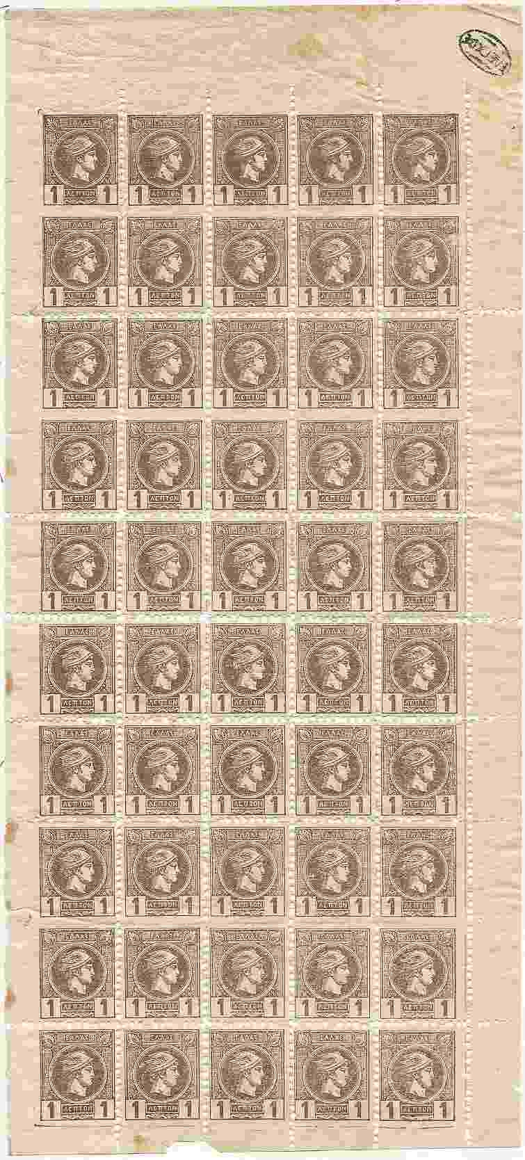 Lot0438 - ΕΛΛΑΔΑ φύλλο των 50 τεμαχίων με Μικρή Καφαλή Ερμή 1λ, εκδόσεις Αθηνών, με σφραγίδα ΕΛΕΓΧΟΣ πάνω δεξιά και σε πολλά σημεία ημιτελής οδόντωση **