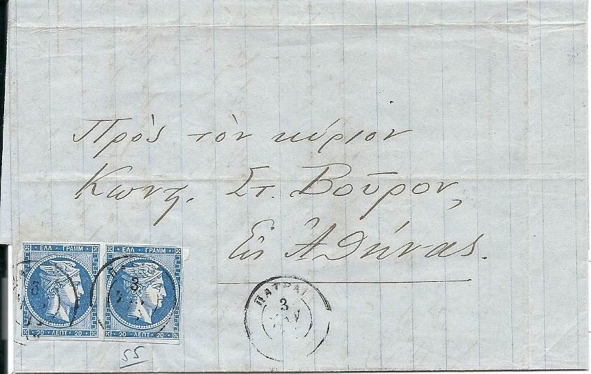 Lot0419 - ΕΛΛΑΔΑ 1873 20 λεπτά ζεύγος Κεφαλών Ερμή σε ταχυδρομημένο φάκελο με σφραγίδα ΠΑΤΡΑΙ 3 ΙΑΝ 73, άφιξη Αθήναι ✉