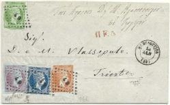 Lot0422 - ΕΛΛΑΔΑ 1866 τέσσερεις (4) Μεγάλες Κεφαλές Ερμή 5λ+10λ+20λ+40λ σε ταχυδρομημένο φάκελο, σφραγίδα Νο 46 ΜΕΣΟΛΟΓΓΙΟΝ 14 ΙΑΝ (66), άφιξη ΠΑΤΡΑΙ 17 ΙΑΝ 66,γραμμή ΠΕΔ και άφιξη Trieste ✉