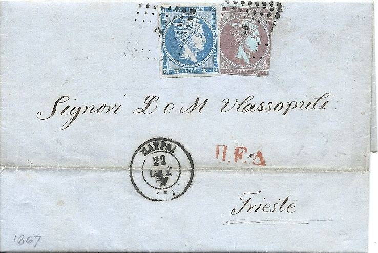 Lot0423 - ΕΛΛΑΔΑ 1866 δύο (2) Μεγάλες Κεφαλές Ερμή 20λ+40λ σε ταχυδρομημένο φάκελο με σφραγίδα Νο 9 ΠΑΤΡΑΙ 22 ΟΚΤ 67, γραμμή ΠΕΔ και άφιξη Trieste ✉