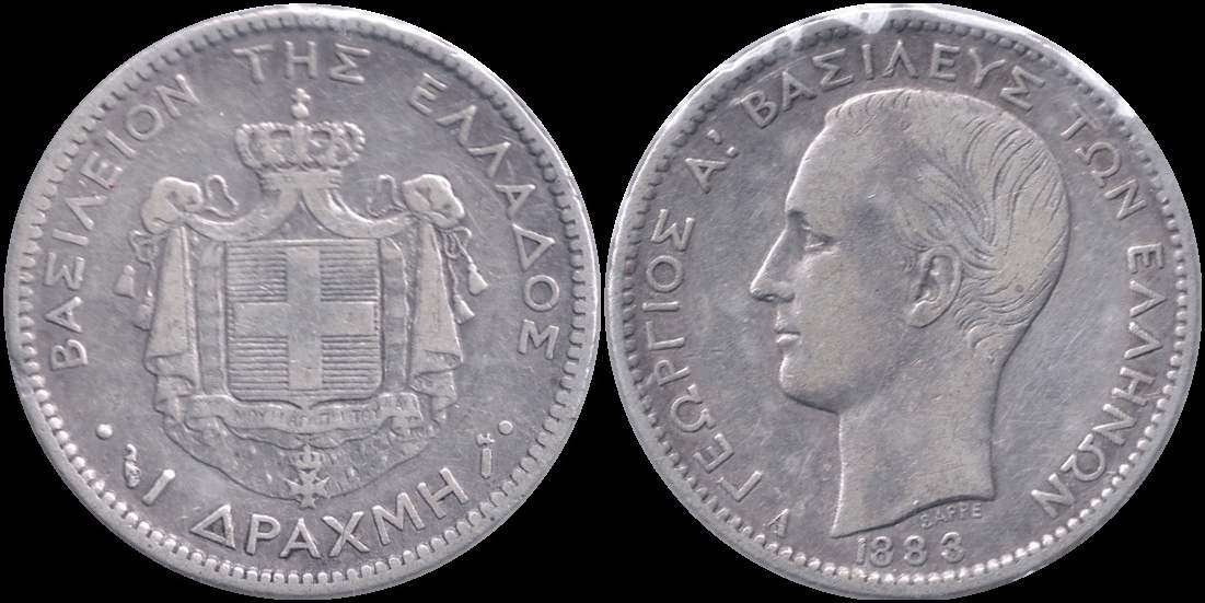 Lot2412 - ΕΛΛΑΔΑ 1868-1873-1874-1883 Βασιλεύς Γεώργιος Α', λαχνός, 1 δραχμή , 4 κομμάτια, αριθμός καταλόγου Hellas : ----