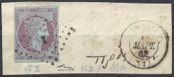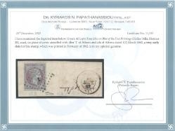 Lot0056 - ΕΛΛΑΔΑ 1861-1862 απόκομμα 40 λεπτά μώβ σε μπλέ (dull mauve on blue), σφραγισμένο Μάρτιο 1862, πολύ νωρίς για γραμματόσημο που τυπώθηκε τον Φεβρουάριο του 1862, συνοδεύεται με πιστοποιητικό