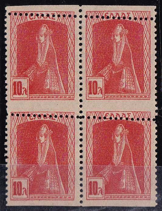 Lot0588 - ΕΛΛΑΔΑ 1927, Τοπία 10 λεπτά με μετατοπισμένη την οριζόντια οδόντωση (σφάλμα), τετράδα **/bl4