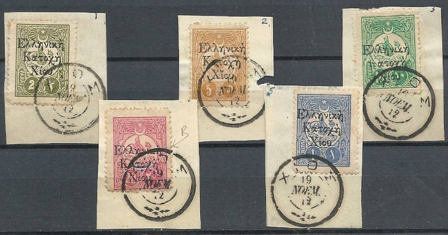 Lot0972 - ΕΛΛΑΔΑ 1912, Νέες χώρες, πέντε (5) Οθωμανικά γραμματόσημα με επισήμανση Ελληνική Κατοχή Χίου, σφραγίδα Χίος 1-11-1912 ☉