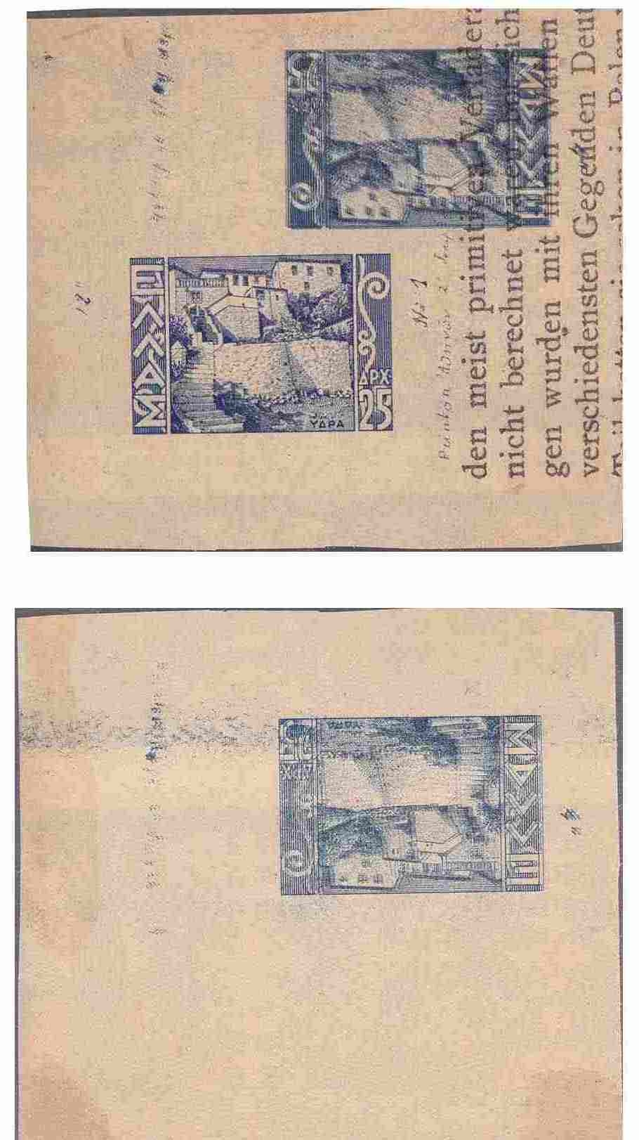 Lot0657 - ΕΛΛΑΔΑ 1942, έκδοση Τοπίων 25 δρχ, τρία (3) δοκίμια (PROOFS) επί σελίδας βιβλίου (μπρός - πίσω) -
