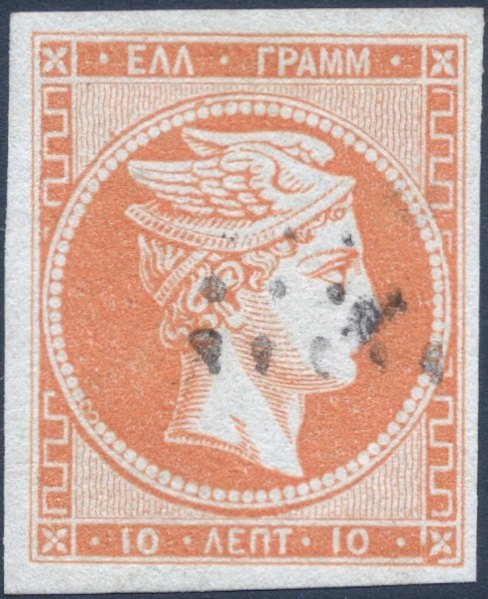 Lot0139 - ΕΛΛΑΔΑ 1868-1869 10λ Πορτοκαλί σε πορτοκαλοπράσινο (Orange on greenish Yellow) με ανισόπεδους ΑΕ ☉