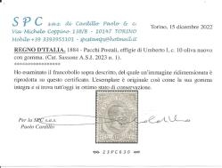 Lot1828 - Italian States Pacchi Postale 1884 10c Oliva MNH CERTIFICATE PAOLO CARDILLO SPC, κατάλογος Sassone No 1 **
