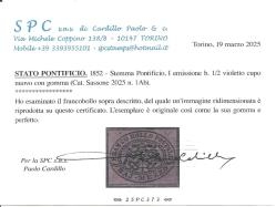Lot1832 - Italian States Papal States 1852 7 BAJ MEZZO 1/2 MH violeto cupo CERTIFICATE PAOLO CARDILLO SPC Perfetto stato ΣΠΑΝΙΟΤΗΤΑ RRR, κατάλογος Sassone No 1Ab *