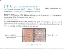 Lot1834 - Regno Di Italia Umberto 1879 20c & 30c MH CERTIFICATE PAOLO CARDILLO SPC, κατάλογος Sassone No 39 & 41 *