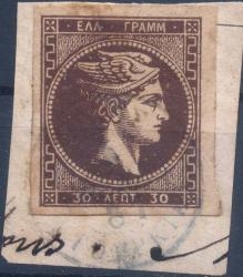 Lot0254 - ΕΛΛΑΔΑ 1876-1877 30 λεπτά καφέ έως πολύ βαθύ καφέ σε κιτρινωπό (brown to sepia on yellowish), με υπογραφή γνησιότητας ☉