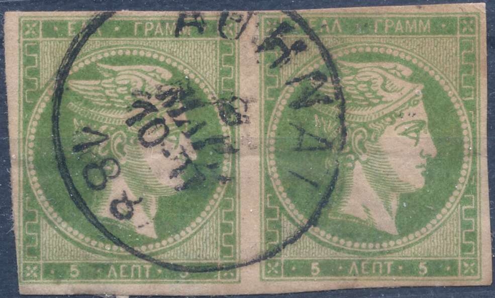 Lot0347 - ΕΛΛΑΔΑ 1880-1886 5 λεπτά κιτρινοπράσινο (yellow green), ζευγάρι ☉/bl2