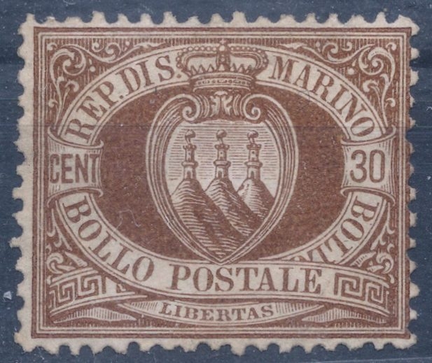 Lot1821 - ΙΤΑΛΙΑ ΣΑΝ ΜΑΡΙΝΟ 1877, 30c, με υπογραφή γνησιότητας, χωρίς γόμμα, Αριθμός καταλόγου Sassone : 6 *