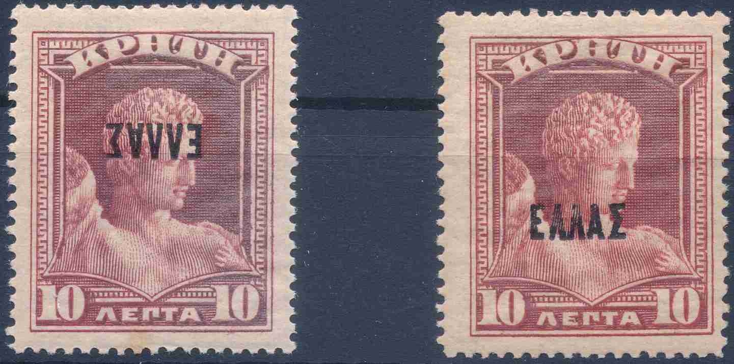 Lot0947 - ΕΛΛΑΔΑ 1908, Νέες χώρες, Κρητική Πολιτεία, επί γραμματοσήμου 10 λεπτά με ΕΛΛΑΣ και ανεστραμμένο, με ποικιλία, δεν κυκλοφόρησαν **