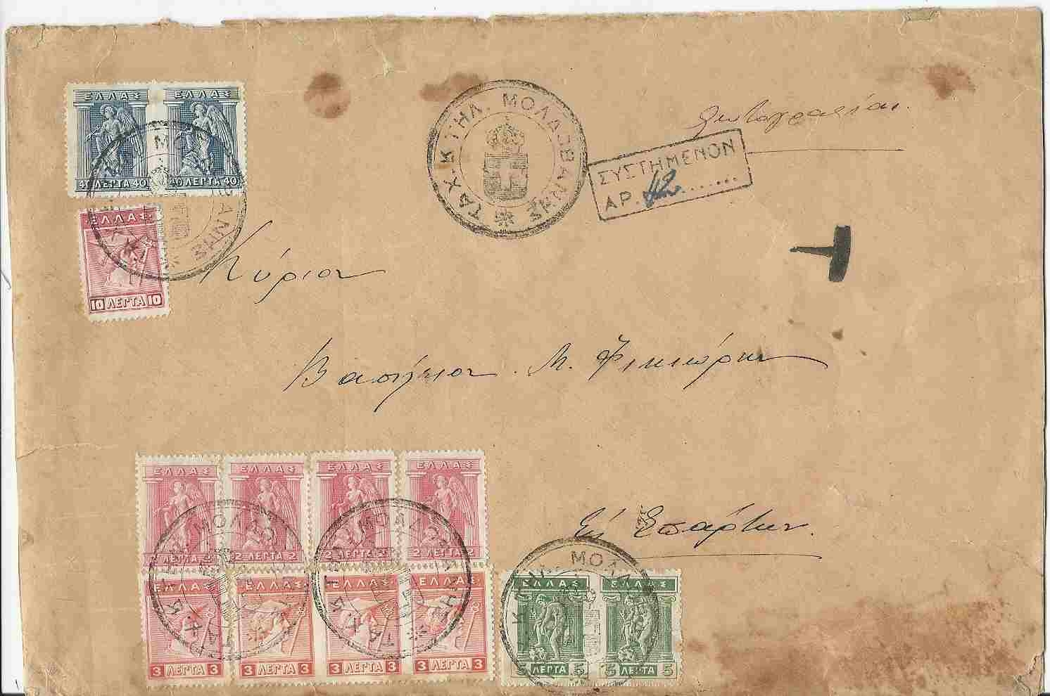 Lot1312 - ΕΛΛΑΔΑ ΜΙΚΡΑ ΑΣΙΑ, συστημένος φάκελλος από Ταχ. Κ Μολδοβάνης προς Σπάρτη, με τέλος 120λ, 100λ για επιστολή πενταπλού βάρους και 20λ για τέλος συστημένου εσωτερικού