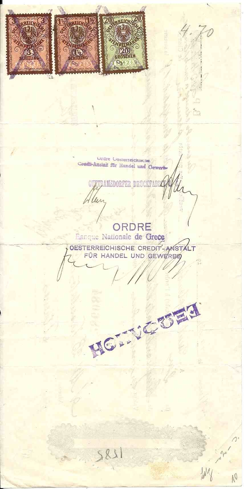 Lot2816 - ΕΛΛΑΔΑ 1930, 3 αυστριακά χαρτόσημα κι 1 ελληνικό σε τραπεζική επιταγή.