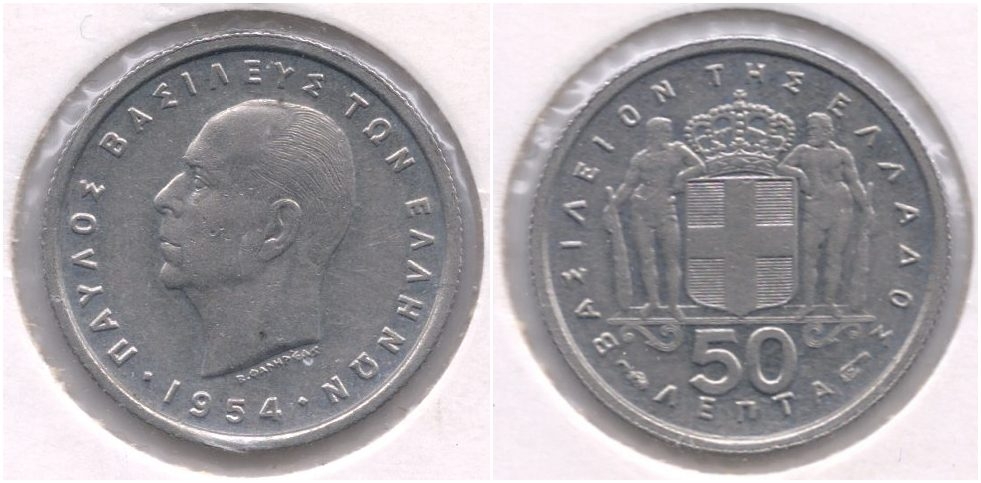 Lot2437 - ΕΛΛΑΔΑ 1954 Βασιλεύς Παύλος 50 λεπτά, αριθμός καταλόγου Hellas : 188