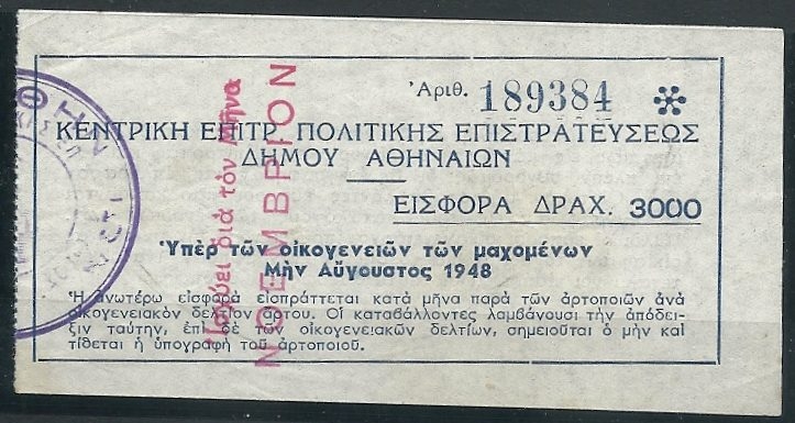 Lot2854 - Εισφορά 3.000δρχ υπέρ των οικογενειών των μαχόμενων. Αύγουστος 1948