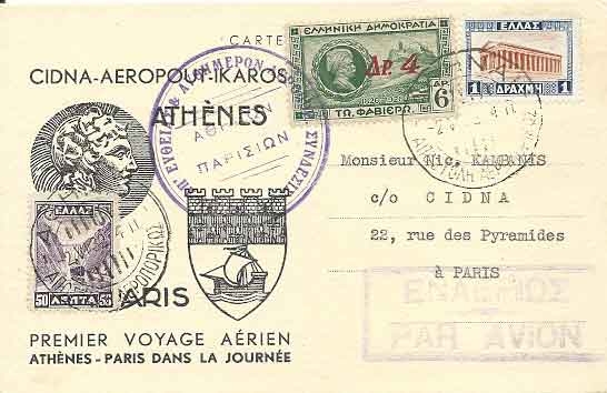 Lot1417 - ΕΛΛΑΔΑ 1932, Ταχυδρομημένη καρτολίνα. Αεροπορική Εταιρεία CIDNA - IKAΡΟΣ, Πρώτη πτήση Αθήνα - Παρίσι αυθημερόν 2-6-32.