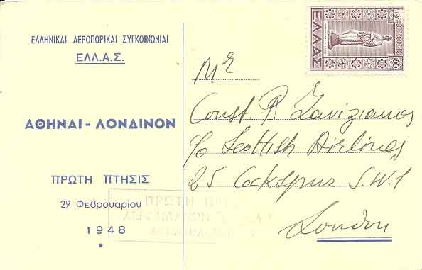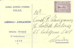 Lot1418 - ΕΛΛΑΔΑ 1948, Ταχυδρομημένη καρτολίνα. Ελληνικαί Αεροπορικαί Συγκοινωνίαι (ΕΛΛ.Α.Σ.) Πρώτη πτήση Αθήνα - Λονδίνο 29-2-48.