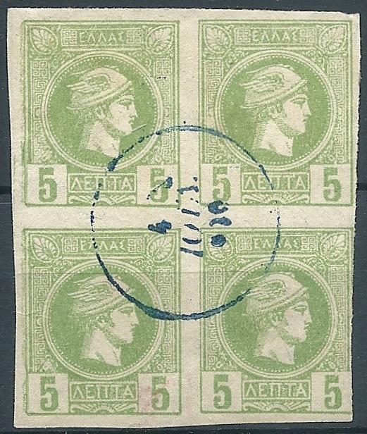 Lot0327 - ΕΛΛΑΔΑ 1897 5 λεπτά πράσινο-λαδί ανοιχτό, τετράδα, πολύ σπάνιο ☉/bl4