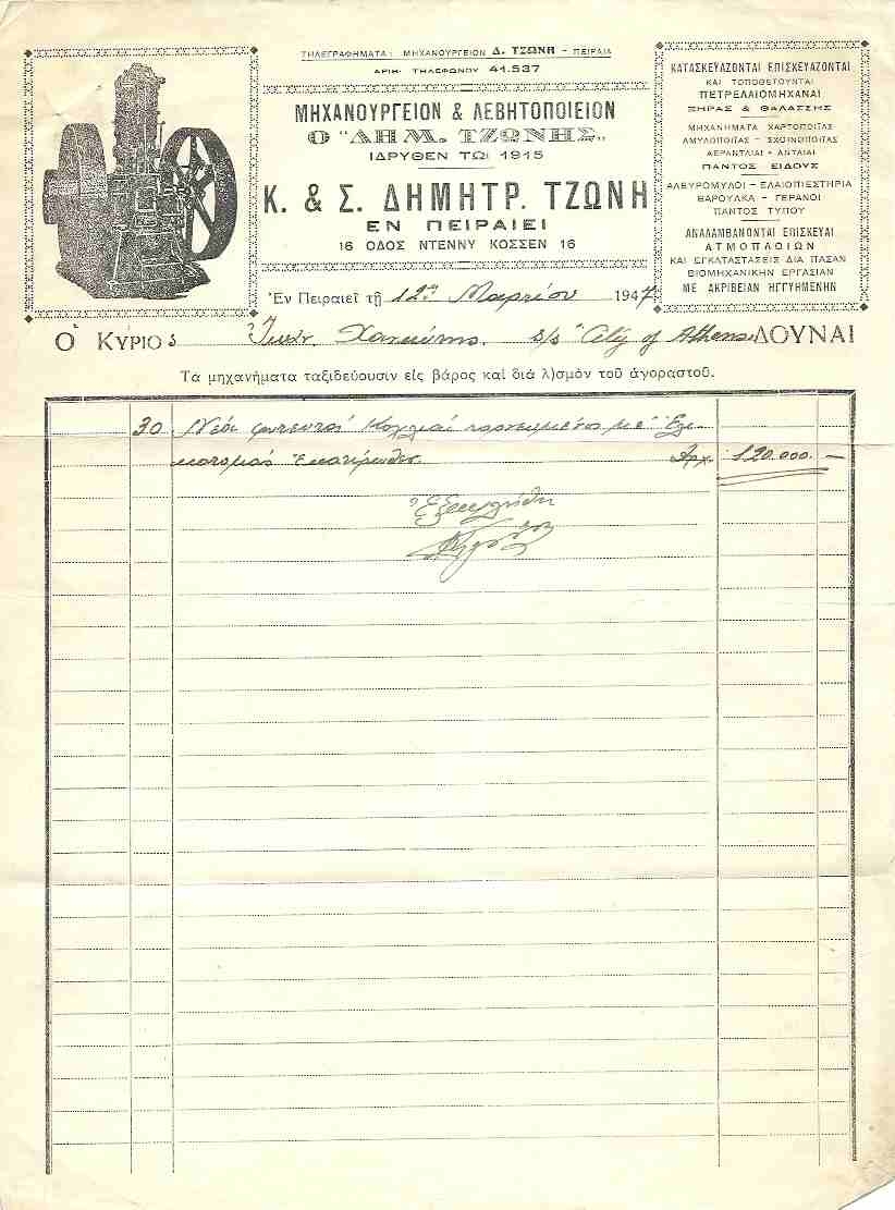 Lot2857 - Δελτίο Αποστολής Κ & Σ. ΔΗΜΗΤΡ. ΤΖΩΝΗ V.F.