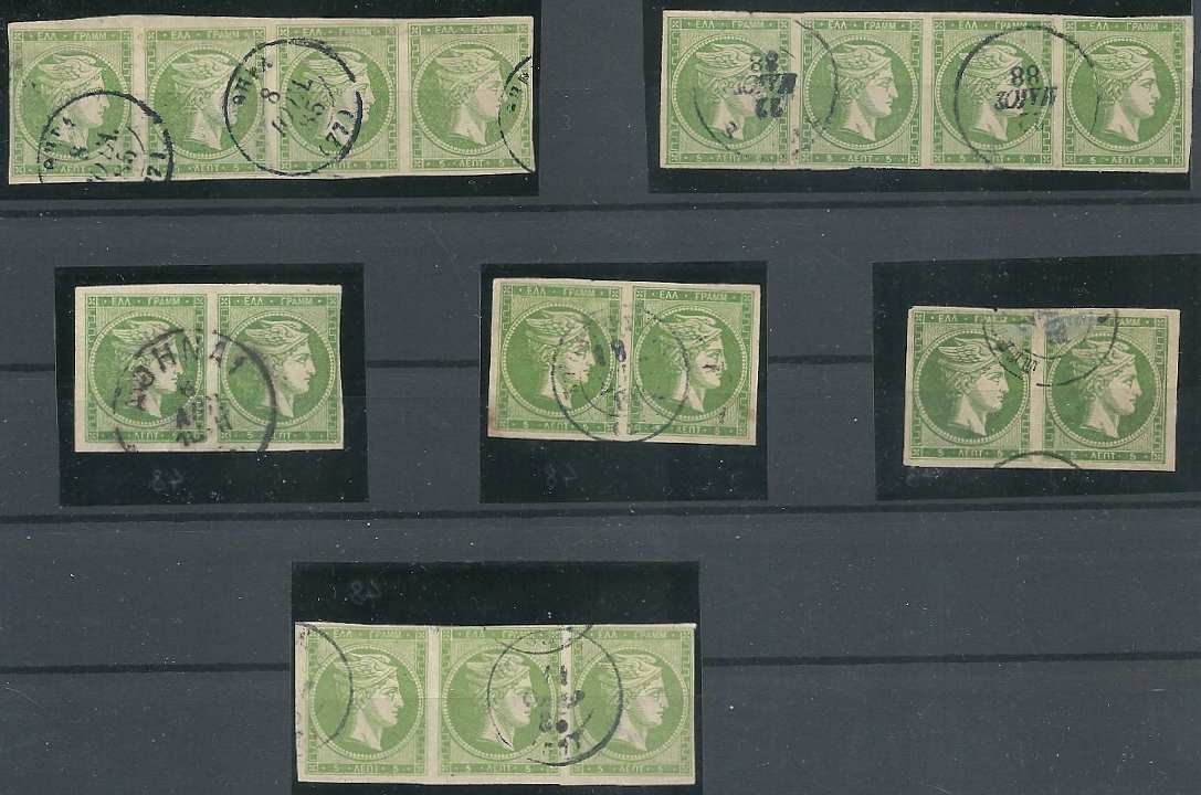 Lot0282 - ΕΛΛΑΔΑ 1880-1886 5 λεπτά πράσινο (green), λαχνός από 2 οριζόντιες λωρίδες 4 γραμματοσήμων, τριάδα και 3 ζευγάρια οριζόντια, υψηλός κατάλογος ☉
