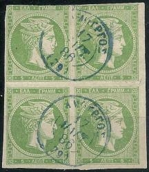 Lot0283 - ΕΛΛΑΔΑ 1880-1886 5 λεπτά πράσινο (green), τετράδα ☉/bl4